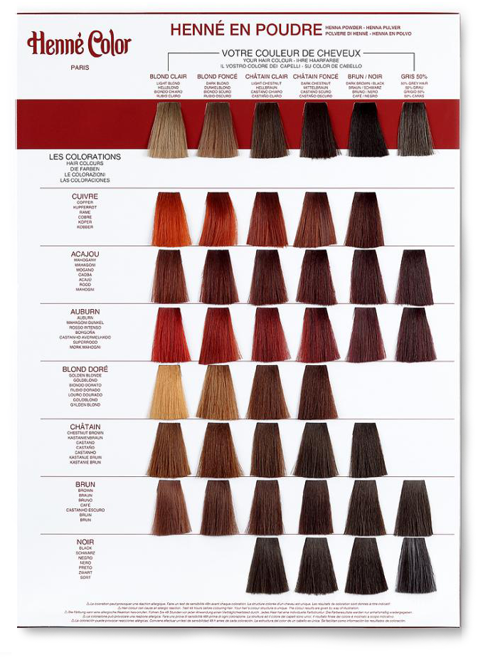 Farbenmöglichkeiten: Haarfarbenpalette auf Haar Strähnen oder basische Haarfarbenpalette (Haarfarben: Hellblond ("Blond clair"), Dunkelblond ("Blond foncé"), Hellbraun ("Châtain clair"), Mittelbraun ("Châtain foncé"), Braun ("Brun"), Schwarz ("Noir"). Tönungscremen: Gold Blond ("Blond doré"), Gold Kastanie ("Châtain doré"), Kupferrot ("Cuivre"), Mahagoni ("Acajou"), Dunkel Mahagoni ("Auburn"), Braun ("Brun"), Schwarz ("Noir").)